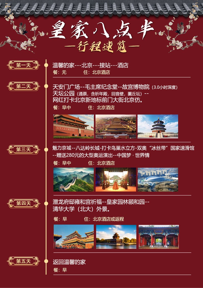 【皇家惠游】-北京品質5日游-不帶錢包游帝都 0自費O購物O景交 皇家惠游 O 購物 0 自費 0 景交 O 暗店 —漫游帝都,追憶冬奧精神…… 住的舒心:精選北京中... |