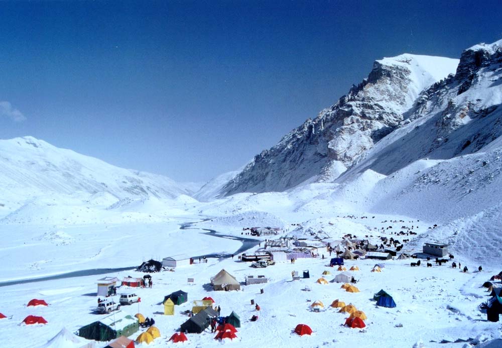 珠峰大本營在兩山間的山谷里,山谷比較平坦,是一個河床,河床上鋪滿鵝卵石,山谷的盡頭就是珠峰。大本營的場地是經過平整的,場地很大,四周是帳篷,都是臨時建筑。每年四月份藏民用拖拉機把帳篷拉上山,九月底把帳篷拆除拉下山。其他時間大本營沒人。大本營的珠峰郵局也是帳篷郵局。