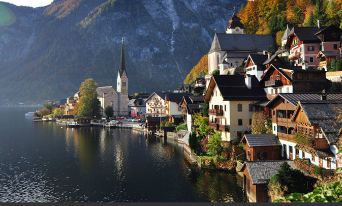 哈爾施塔特:整個小鎮(zhèn)沿湖而建,人口也很少,這是一個美得令人心醉的湖邊小鎮(zhèn)。湛藍(lán)的湖水、明凈的天空、多彩的歐式木樓、尖頂?shù)慕烫茫渖锨嗌降牡褂啊⒀┌椎奶禊Z、斑斕的秋色,組成了一幅絕妙的歐洲山水畫卷。