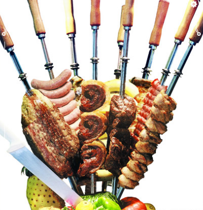 巴西烤肉:巴西的烤肉主要有烤牛肉、雞腿、香腸甚至菠蘿也烤。它是把這些原料腌過后分別穿在一個長約一米帶凹槽的扁平鐵棍上放在碳火上慢慢燒烤,期間要刷幾次油,烤至兩面金黃、肉香撲鼻的時候就可以食用了。