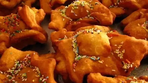 點心:一般這種點心會有兩種內陷,甜山楂糕或是甜紅薯糕;此點心的外面是用面粉做的,不過一般因為在油里炸過后,變得香香脆脆的。在剛出油鍋的時候,還會在上面撒上不同種類的糖粉,有白色的,紅色的,還有五顏六色的。