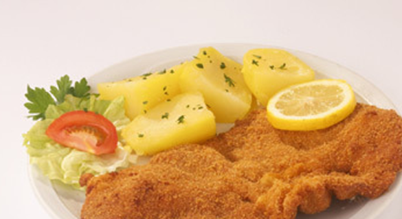 維也納小牛排加土豆沙律:小牛肉排切成大片,浸入蛋糊,外面裹上面包屑,放入油鍋內炸透。拼盤配檸檬片和土豆沙律。維也納肉排有時也用豬排作成,其烹制辦法和拼盤同牛排一樣。