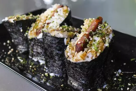 午餐肉飯團(tuán):是由一片煎的香香的午餐肉蓋在白米飯上,淋上醬汁,外面包上紫菜,最后撒上芝麻。大口吃肉的感覺很贊,形狀方方正正的很好咬,自己做的話也不難哦。科普一下Sushi和Musubi的區(qū)別,Sushi是用白醋調(diào)過味的壽司米,而Musubi就是普通蒸好的白米飯。