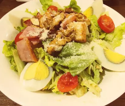凱撒沙拉:這個(gè)大名鼎鼎的沙拉其實(shí)和古羅馬的“凱撒大帝”沒有任何關(guān)系。“凱撒”是創(chuàng)作這道沙拉主廚的名字。發(fā)源地是美墨邊境一家位于Tijuana(提娃那)城的小餐館。1924年,意大利主廚Caesar Cardini用了手邊僅剩的帕馬森起司,橄欖油,腌制鳳尾魚,和英國(guó)醬油醋等調(diào)制成的醬汁,和生菜混合在一起。最后撒上面包丁,創(chuàng)造出了這道經(jīng)典的凱撒沙拉。
