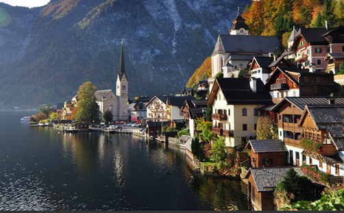 哈爾施塔特:整個小鎮沿湖而建,人口也很少,這是一個美得令人心醉的湖邊小鎮。湛藍的湖水、明凈的天空、多彩的歐式木樓、尖頂的教堂,配上青山的倒影、雪白的天鵝、斑斕的秋色,組成了一幅絕妙的歐洲山水畫卷。