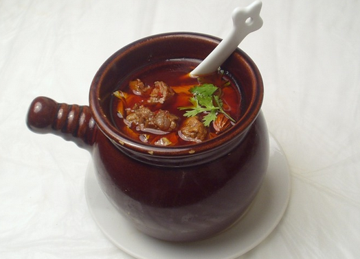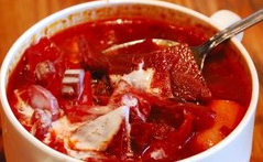 烏克蘭紅菜湯:紅菜湯就是中國的羅宋湯,正宗的紅菜湯一定要先用紅菜頭,格瓦斯放在罐中燜煮,煮開后再放入白菜、甜蘿卜,煮爛后放入蔥、蒜、油、鹽、肉——這是最基本的程序。