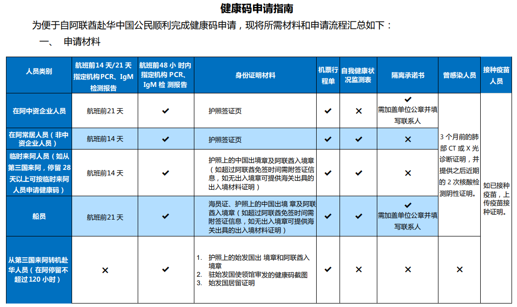 一、完全接種新冠疫苗和按時接種加強針。所有赴華乘客須完全接種新冠疫苗和按時接種加強針(疫苗必須被阿聯酋衛生與社會預防部認可或被世界衛生組織列入使用名單),乘機前提供相關疫苗接種證明(官方機構出具)。12歲以下兒童可豁免此接種疫苗及加強