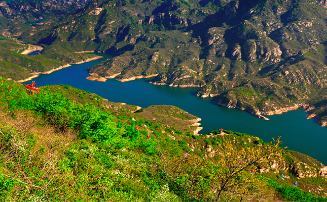 水庫大壩坐落在景區(qū)中央,將景區(qū)分為南、北、西、東四部分。南部水深控制在1米,以竹筏、手劃船為主。北部水深40~50米,設(shè)龍舟、畫舫、快艇等大型機(jī)動船,夏季還開設(shè)沙灘浴場。西部建有青龍峽索道,索道全長800米,落差369米,乘索道來景區(qū)最高峰——玉皇臺。站在此處:東遙萬里,密云水庫碧波萬頃山水一色;南瞰千頃,京北大平原萬畝良田一望無際;西映夕陽,懷柔古城遙遙相望山重水覆;北覽群峰,長城蜿蜒狼煙依舊靜桓翠柏。東部設(shè)有蹦極跳、攀巖、速降、水上秋千、定向滑翔等娛樂項目,自1998年以來,青龍峽每年舉辦植樹節(jié)、踏青賞花、登山觀古長城、消夏避暑節(jié)、秋季采摘節(jié),冬季冰雪游更是吸引了大量游客。主要景觀有絕壁攀云、澗伏青龍、煙波勝境、濟(jì)公觀水、金蟬望月、一石六景、仙人騎龜、玉兔觀城、飛瀑狂瀉、玉皇臺等20多個。