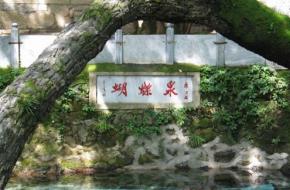 蝴蝶樹在泉池西北角的池邊有一棵蒼勁的夜合歡古樹,枝葉婆娑,樹蔭遮天蔽日,這就是蝴蝶樹,橫跨泉上,每當(dāng)春末夏初,古樹開花,狀如彩蝶,且散發(fā)出誘蝶的清香味,其時(shí)蝴蝶群集飛舞,一只只“連須鉤足”,從枝頭懸至泉面,形成千百個(gè)蝶串,象一條條五彩繽紛的彩帶。