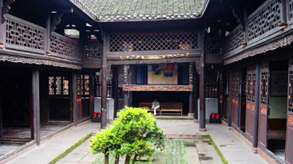 楊家人信風(fēng)水,大門斜開,正對(duì)著沱江,可以使祖業(yè)千秋,萬世榮昌,如沱江之水源源不斷;。進(jìn)入大門,抬頭可見二重門上的牛頭和門上蝙蝠木雕。祠堂是典型的四合院建筑,木結(jié)構(gòu),上下兩層,由大門、戲臺(tái)、過廳、廊房、正廳組成。