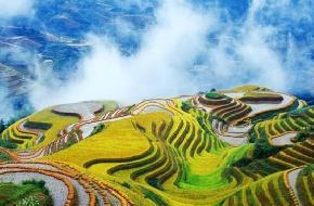 龍勝縣龍勝梯田群規模宏大,全部的梯田分布在海拔300-1100米之間,最大坡度達50度,一層層從山腳盤繞到山頂,層層疊疊,高低錯落。其線條行云流水,其規模磅礴壯觀。是桂林旅游的一個重要組成部分。