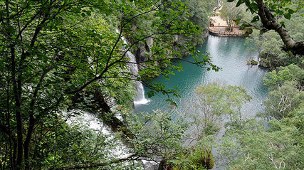 綠淵潭潭水上方的峭壁上有兩條小瀑布順流而下,更增添景致。下到綠幽潭的樓梯狹窄又陡峭,需注意安全,從綠淵潭下去一路都有標(biāo)示,不能走回頭路,所以一般是先去小天池,再去綠淵潭。