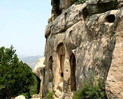 在山西太原市西南40公里天龍山腰。天龍山亦名方山,海拔高1700米。這里風光秀麗,歷史上曾是北齊皇帝高洋之父高歡的避暑宮。四周山巒起伏,遍山松柏蔥郁,山頭龍王石洞泉水蕩漾,山前溪澗清流潺潺。天龍山石窟創建于東魏(公元534—550年),高歡在天龍山開鑿石窟,高歡之子高洋建立北齊的晉陽為別都,繼續在天龍山開鑿石窟。隋代楊廣為晉王,繼續開鑿石窟,唐代李淵父子起家于晉陽,建造石窟達到高峰。