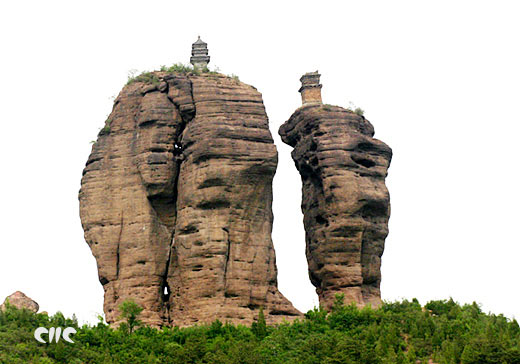 雙塔山旅游景點介紹之概況,市區西南30里處有兩顆巨大巖柱南北排開,比肩而立,狀似寶塔,峰頂各有磚塔一座,故名雙塔山。兩峰高低大體相同:北峰粗大,高40余米,周長74米;南峰上粗下細,周長34米。雙塔山陡直而立,高不可攀,近代無人上去過。峰頂磚塔何人、何時、何故所建,不得而知,一直是個謎。今人用望遠鏡觀測,北峰頂的磚塔高約2米,圓錐形,無門。南峰頂磚塔座北朝南,高5米余,方形,邊長2米多,門高約1.5米,寬1.3米,四角置木據,有鐵棍挑出,上掛銅鈴。東、西、南三面墻是青磚壓縫,北墻齊縫直茬。1976年前北墻裂縫較大,寬處大約有20多公分,唐山大地震以后,磚塔不但沒倒,裂隙反而拼合。