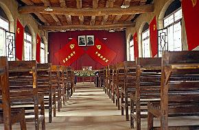 這里有毛澤東、周恩來、劉少奇、朱德、任弼時等人的舊居。周恩來舊居在中共中央舊址的東面,是借用老鄉的土坯房,整個院落共12間房,是個四合院,北房東邊部分是4間,前邊一間(兩間房一個室)是周恩來的辦公室,后邊兩間是警衛員的住室;北房西邊共三間,東邊一間(外間)是鄧穎超辦公室,里面是二人的寢室。院子中央栽有一棵梨樹,辦公室窗前種有一片翠竹。周恩來舊居陳列著近20件文物,較為珍貴的是在西柏坡制作并一直使用的兩用書架,打開可作書架,折起來就是箱子。另外,還有兩屜辦公桌、收音機、電話機和沙發等。