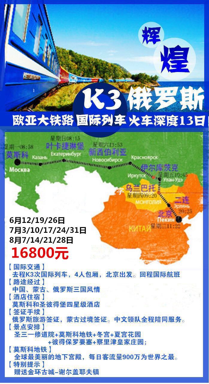 國際列車-俄羅斯經典雙城13日游【去程K3次國際列車/回程飛機 交通工具:【國際列車】:北京-莫斯科,K3次國際列車(4人硬臥/2人高級包廂) 【境外火車】... |