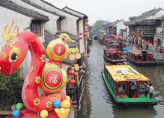 4月17日,載著中外游客的仿古游船行駛在蘇州山塘街水巷。陽春四月,古城蘇州頗具特色的山塘街水上旅游項目成了中外游客觀光賞景的好選擇。游人在休閑旅游的同時,更目睹了“東方威尼斯水城”的美麗景色。 (王建康)