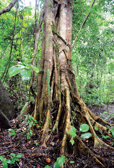 第一次雨林徒步距離并不長,來回1.5公里左右,也沒有特別的上下陡坡,卻耗時整整2個小時。走在雨林中幾乎看不到陽光,但潮濕和悶熱依舊使徒步變得很辛苦,加上身上背著沉重的照相器材和三腳架,腳底還不時和泥濘對抗,所以走了不到20分鐘,我已經滿頭大汗,全身濕透,這就是雨林的威力吧。