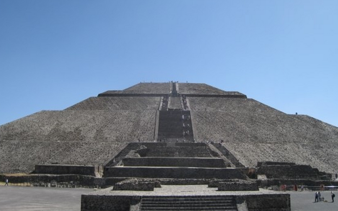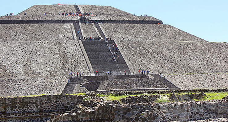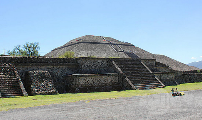 氣勢恢宏的太陽金字塔(底座225×222米)是世界第三大金字塔。它挺立在大道東側,高達63米(原來的高度是75米),體積有一百萬立方米。它是特奧蒂瓦坎古城遺址中規模最大的建筑物,是為了舉行宗教儀式而建,平坦的頂部原本應該有一座神廟。